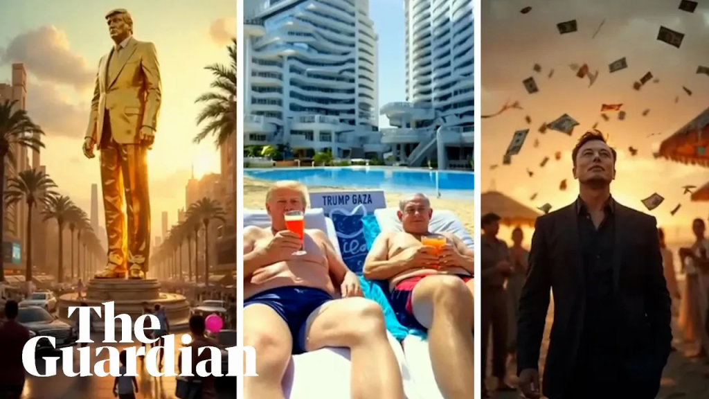 这段时长约30秒的视频以加沙的战后废墟开场,随后画面急转,呈现出一个宛如迪拜或迈阿密的奢华度假胜地。高楼大厦林立,游艇停泊在海湾,孩子们在沙滩上嬉戏,美元从天而降,甚至还有特斯拉汽车穿梭街头。视频中不仅出现了特朗普的巨型金像和纪念气球,还包括特斯拉创始人埃隆·马斯克(Elon Musk)在海滩上大快朵颐的场景。最引人注目的莫过于特朗普与内塔尼亚胡的泳池派对,以及那些蓄着胡子、身着比基尼的肚皮舞者,他们的装扮让人联想到哈马斯(Hamas)的绿色头带。这一荒诞的组合迅速点燃了网络讨论。