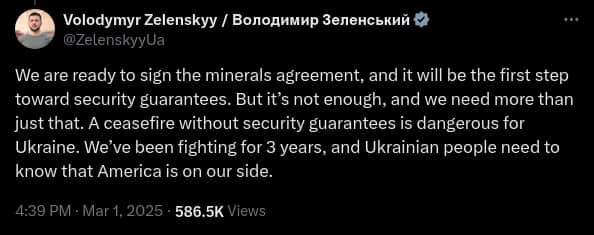 在与美国总统唐纳德·特朗普举行紧张会谈后,乌克兰总统弗拉基米尔·泽连斯基表示,乌克兰准备与美国签署矿产协议,同时强调需要更广泛的安全保障。在一则社交媒体帖子中,泽连斯基表示:“我们准备签署矿产协议,这将是迈向安全保障的第一步。但这还不够,我们需要的不仅仅是这些。没有安全保障的停火对乌克兰来说是危险的。我们已经战斗了三年,乌克兰人民需要知道美国站在我们这一边。”12